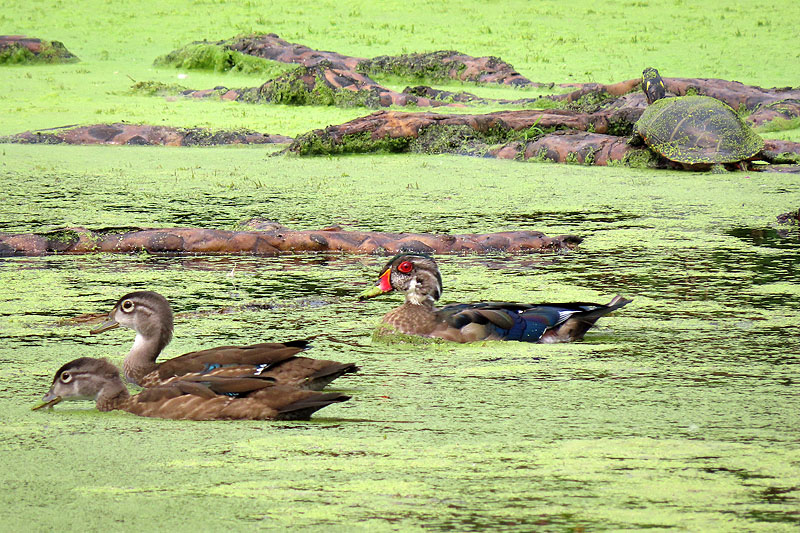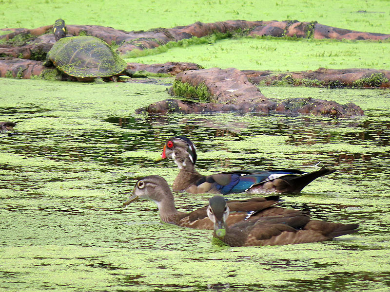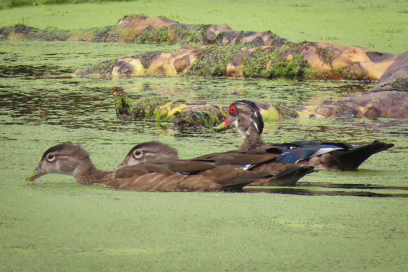 Three Wood Ducks (Aix sponsa) The red-eyed male is getting his adult plumage.