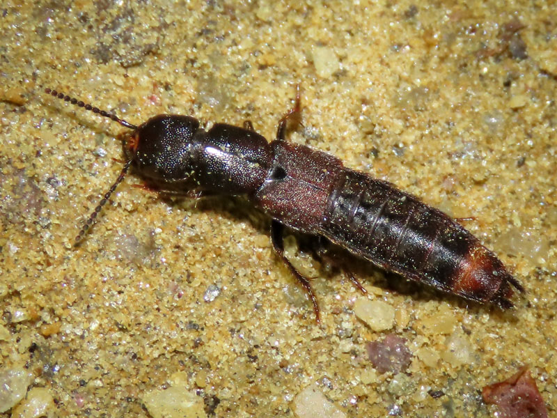 An adult Rove Beetle (Family Staphylinidae). The beetle has complete hind wings "orgami folded" to fit inder short wing covers called Elytra..