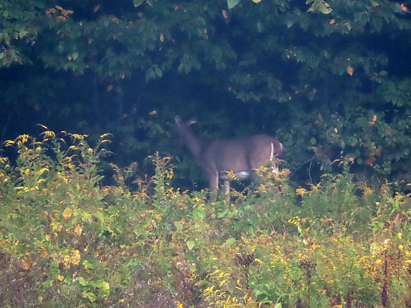 White-tailed Deer (Odocoileus virginianus) at the wood line beyond the field of Goldenrod.
