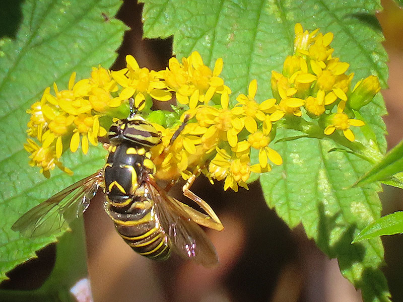A superb wasp mimetic Syrphid Fly (Spilomyia longicornis).