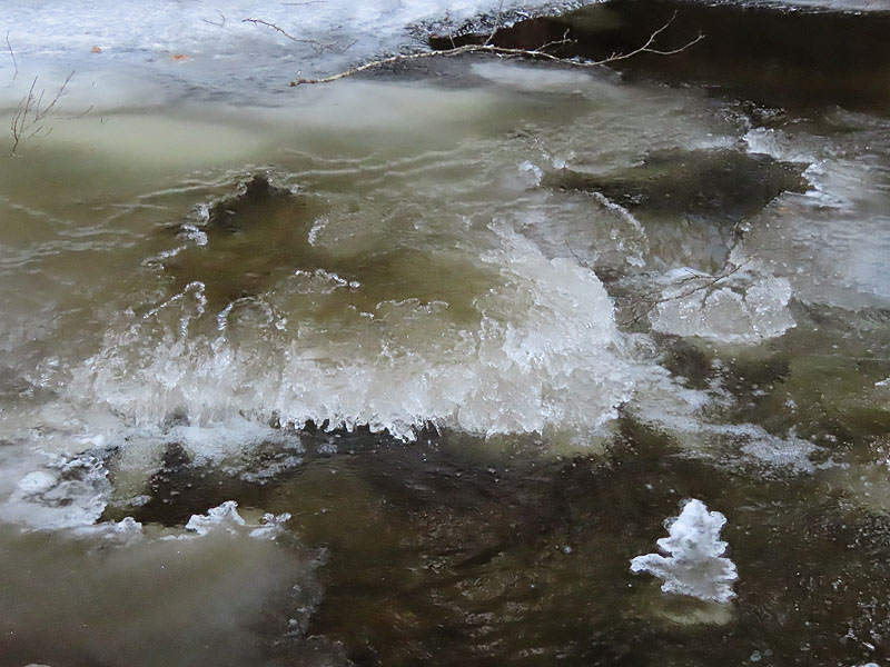 January 14th. For a few days, there have been roughly a dozen Mallards (Anas platyrhynchos) in the rare open water of the channel, but almost completely screened off by shrubs between the trail and the water. See what I mean? I discarded 7 other photos. This was the "best" one.