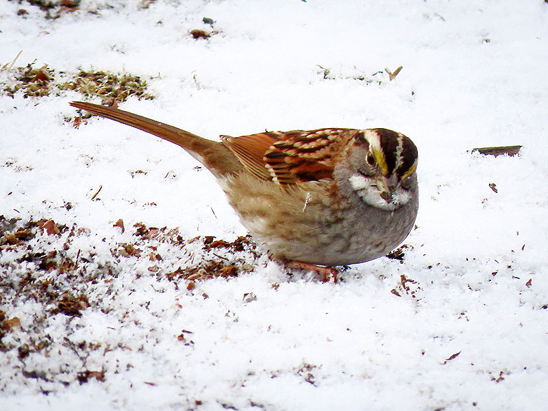 More Song Sparrows with White-throated Sparrows (Zonotrichia albicollis) mixed in.