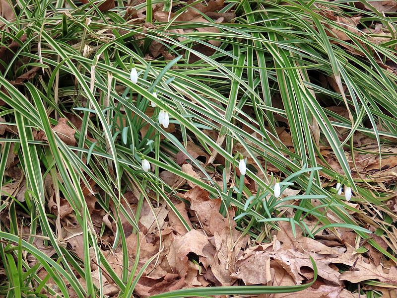 Ornamental Snowdrops (Galanthus nivalis) under the train mural.