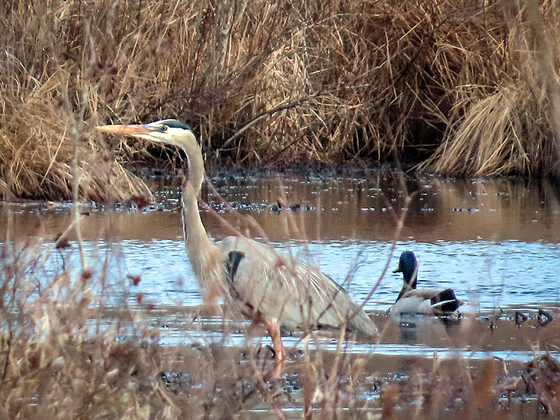 March 28th. Great Blue Heron (Ardea herodius) about 50 feet from where it was yesterday morning, now joined by a male Mallard (Anas platyrhynchos).