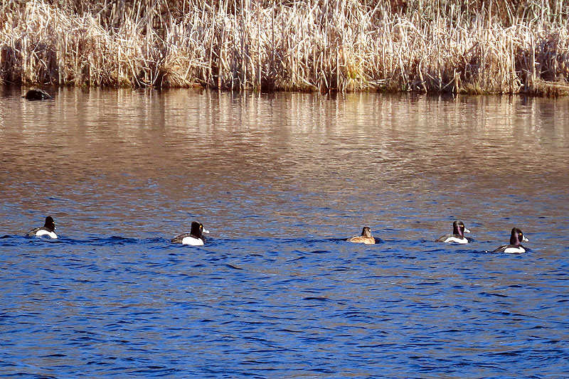 Six Ring-necked Ducks; female upper left.