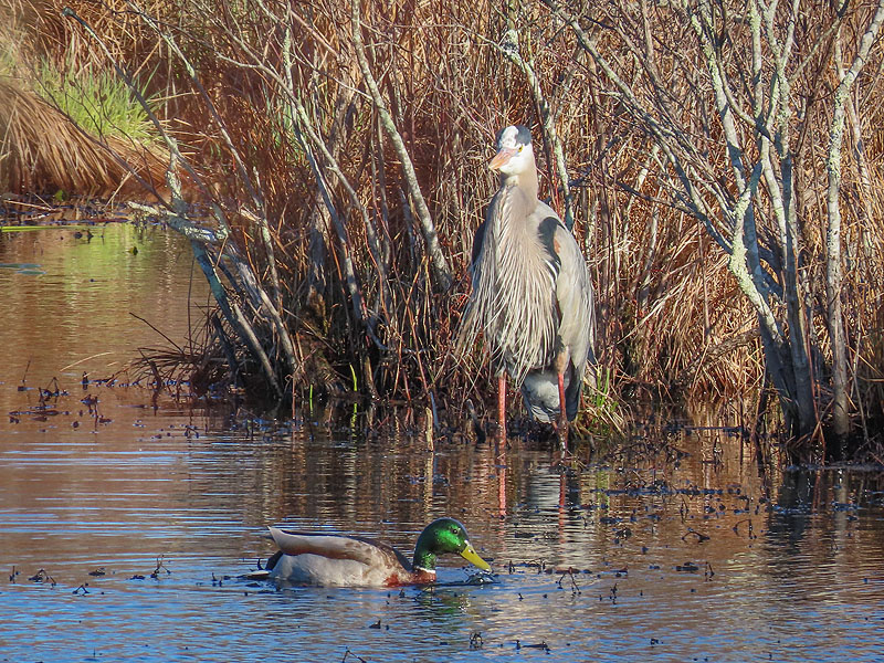 Great Blue Heron (Ardea herodius) and male Mallard (Anas platyrhynchos).
