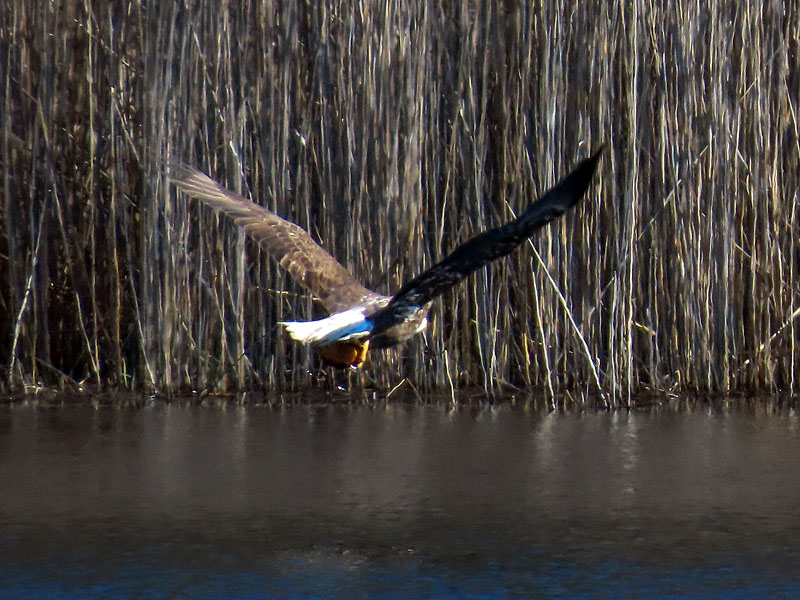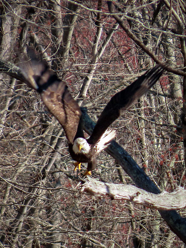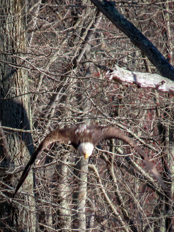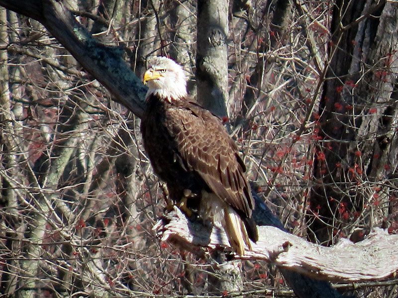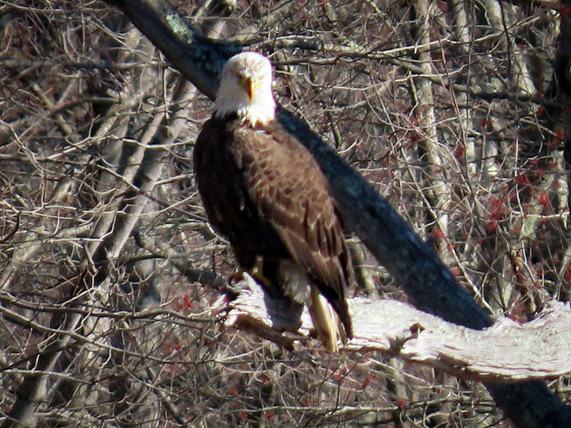 I stopped by Norton's Pond off River Road for a quick look. Nothing happening so I got back into my truck... and saw this adult Bald Eagle (Haliaeetus leucocephalus) circle low. Got out and was able to spot it perched far across the pond.