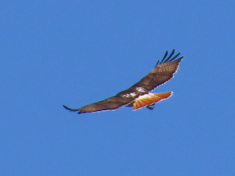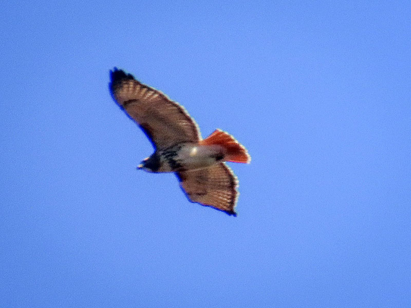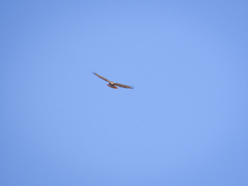 A Red-tailed Hawk (Buteo jamaicensis) circling high overhead.