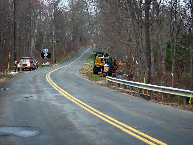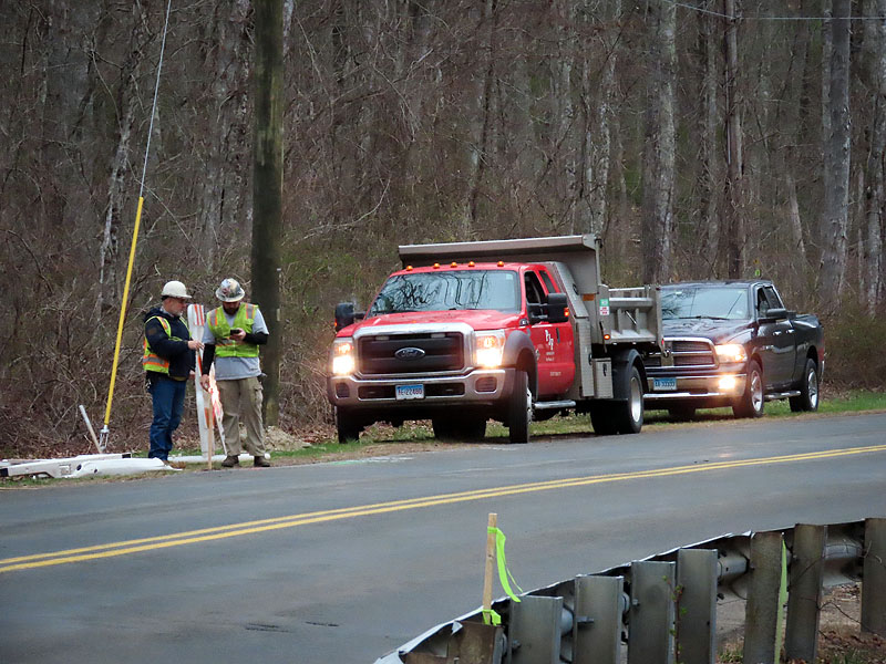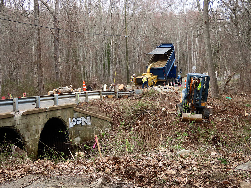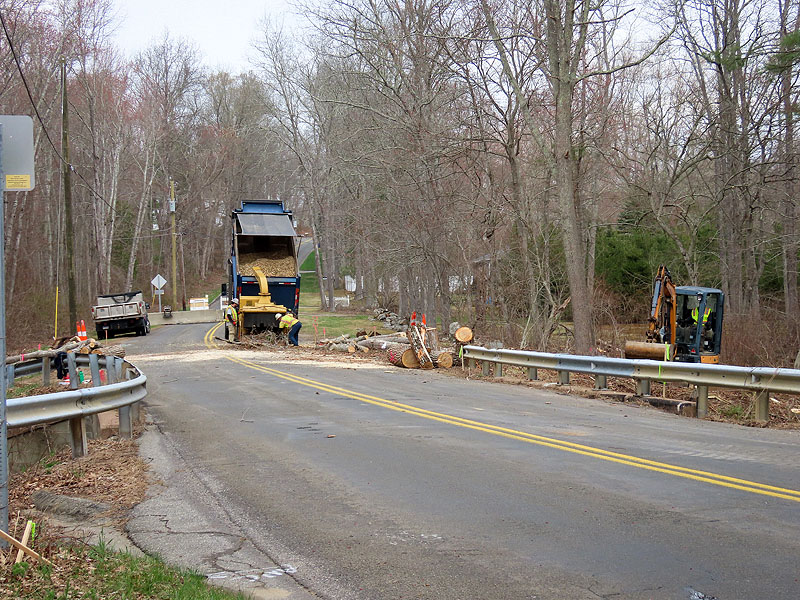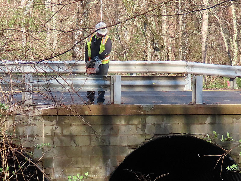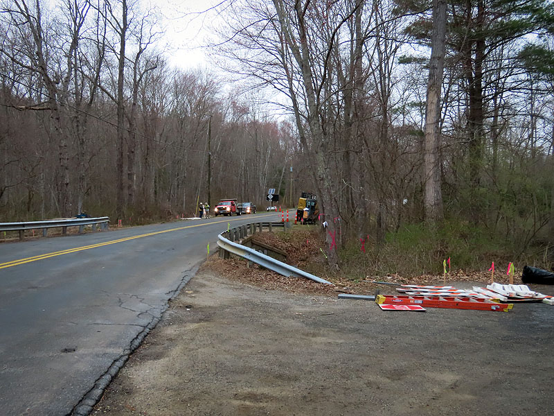 April 16th. A worker got an early start today, sawing off guard rails at Old Colchester Road.