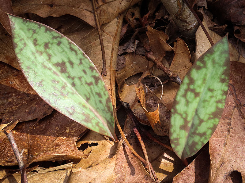 Trout-lily (Erythronium americanum). Spotted leaves are definitive. Yellow flowers will come in awhile.