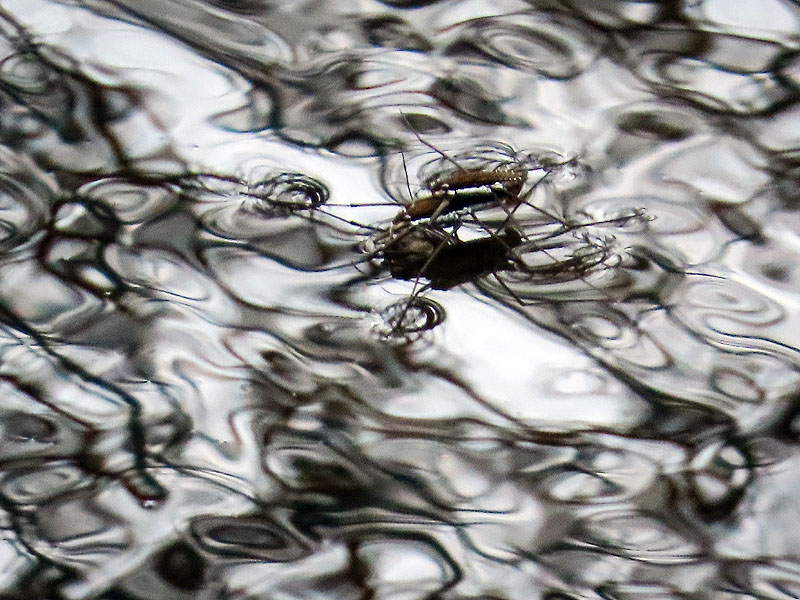 A mated pair of Common Water Striders (Family Gerridae, Aquarius sp.). Note the dimples their legs make in the surface tension.
