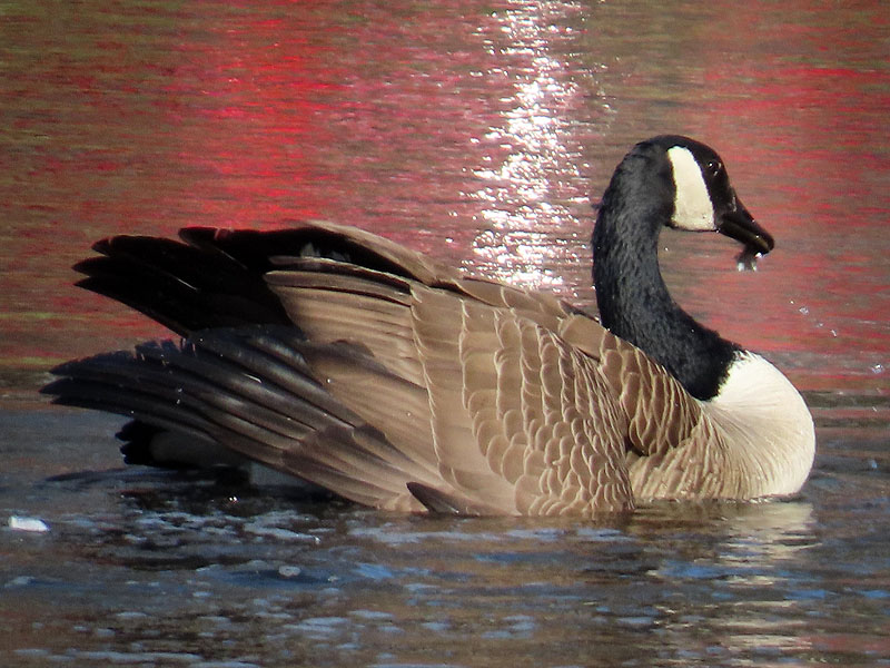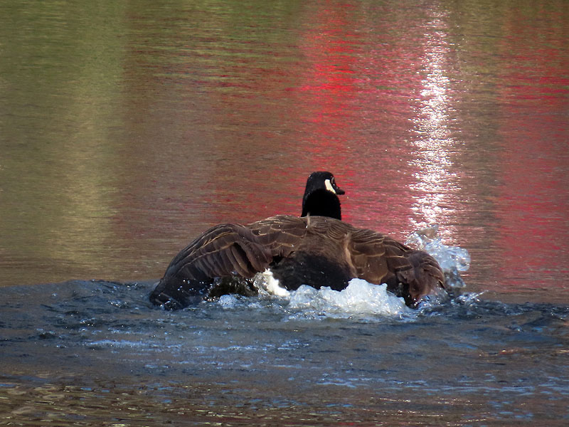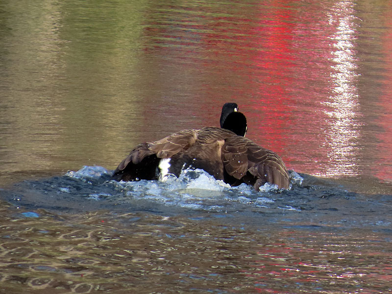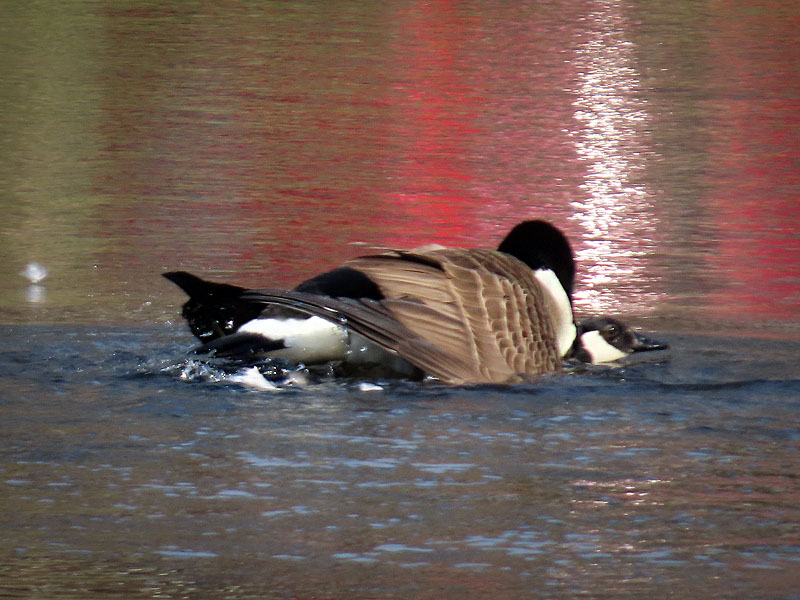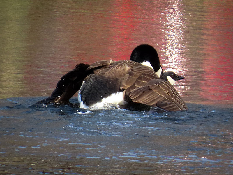 Late afternoon at Cranberry Bog. The Canada Goose (Branta canadensis) pair mating. Note, the red reflections are of a car in the parking lot.