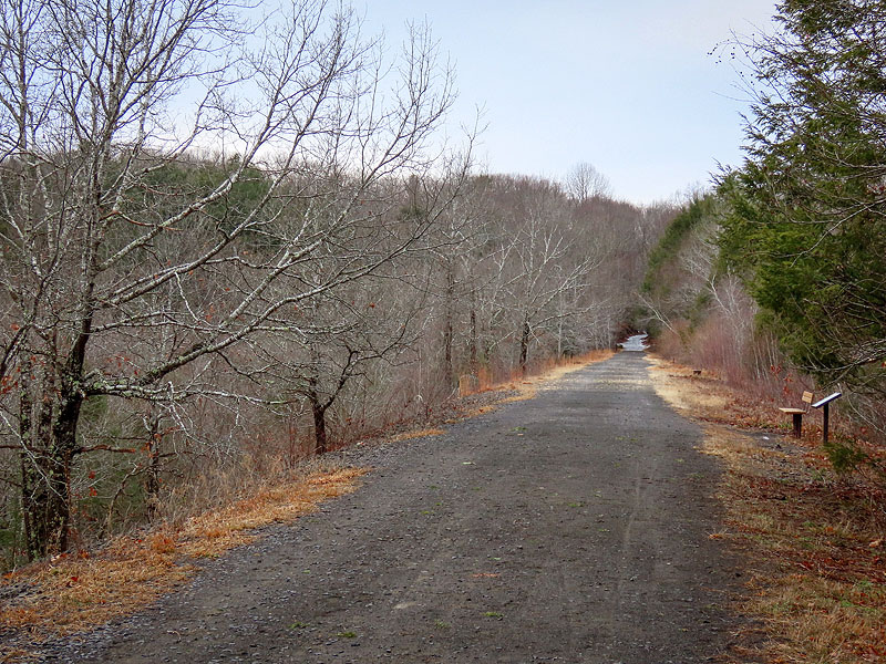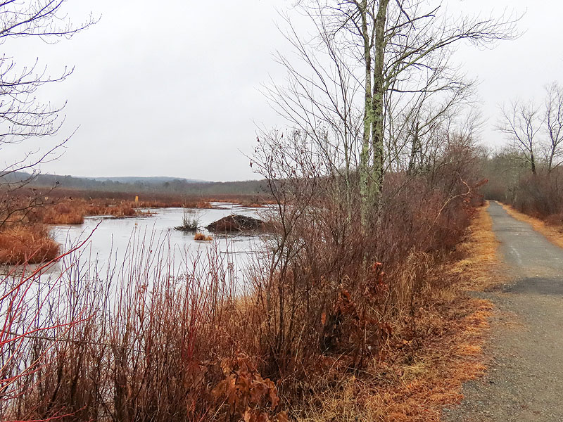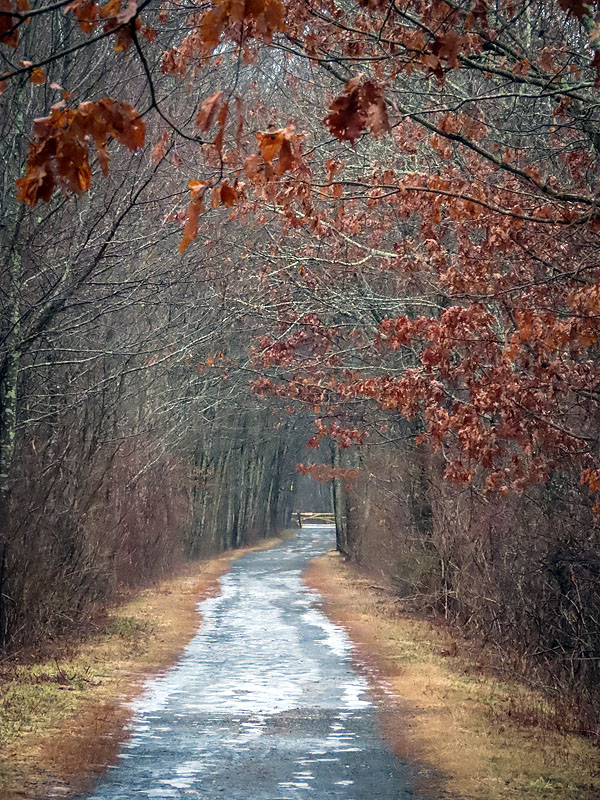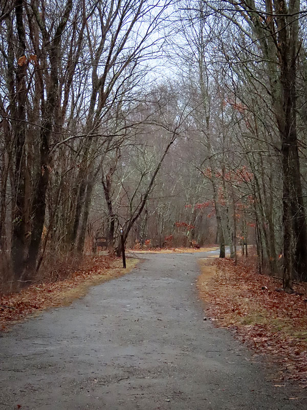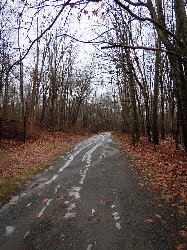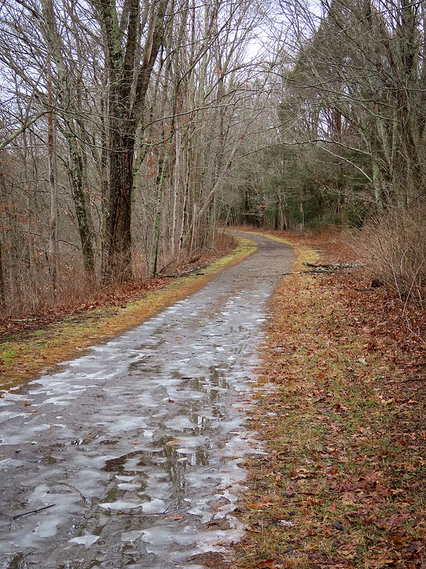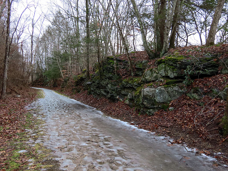 Nearing the rock cut by Bull Hill Road, there was quite a bit of ice. Although I was wearing cleats, I stayed at the edges where most of the ice was gone.
