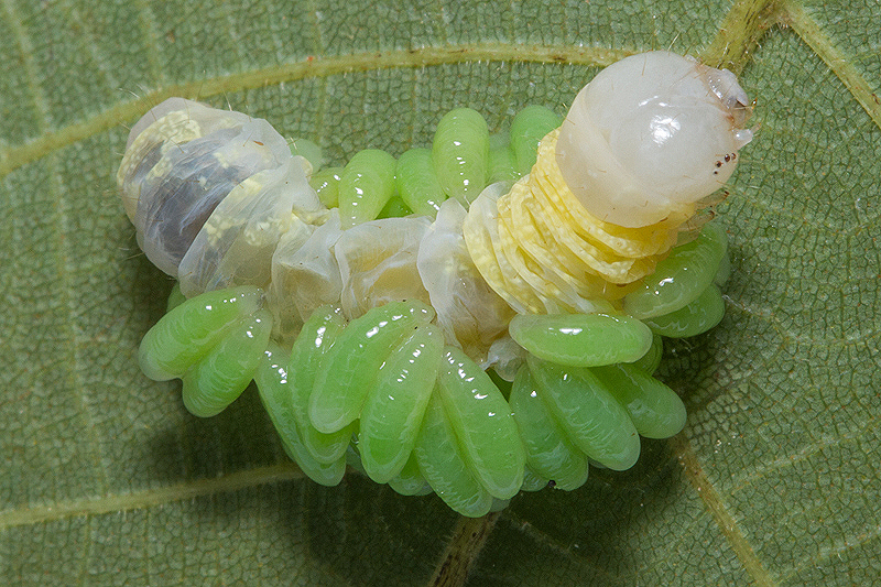 July 5th, 5:00 P.M. - 8 hours after the first photos were taken. The wasp larvae have grown while the caterpillar has shriveled up.