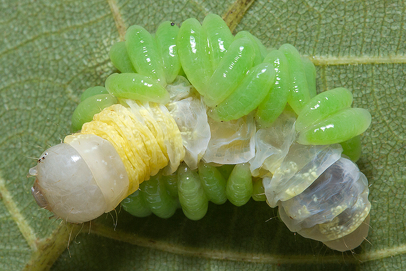 The caterpillar is abnormally pale - it almost seems as if the wasp larvae are sucking the color out of it.